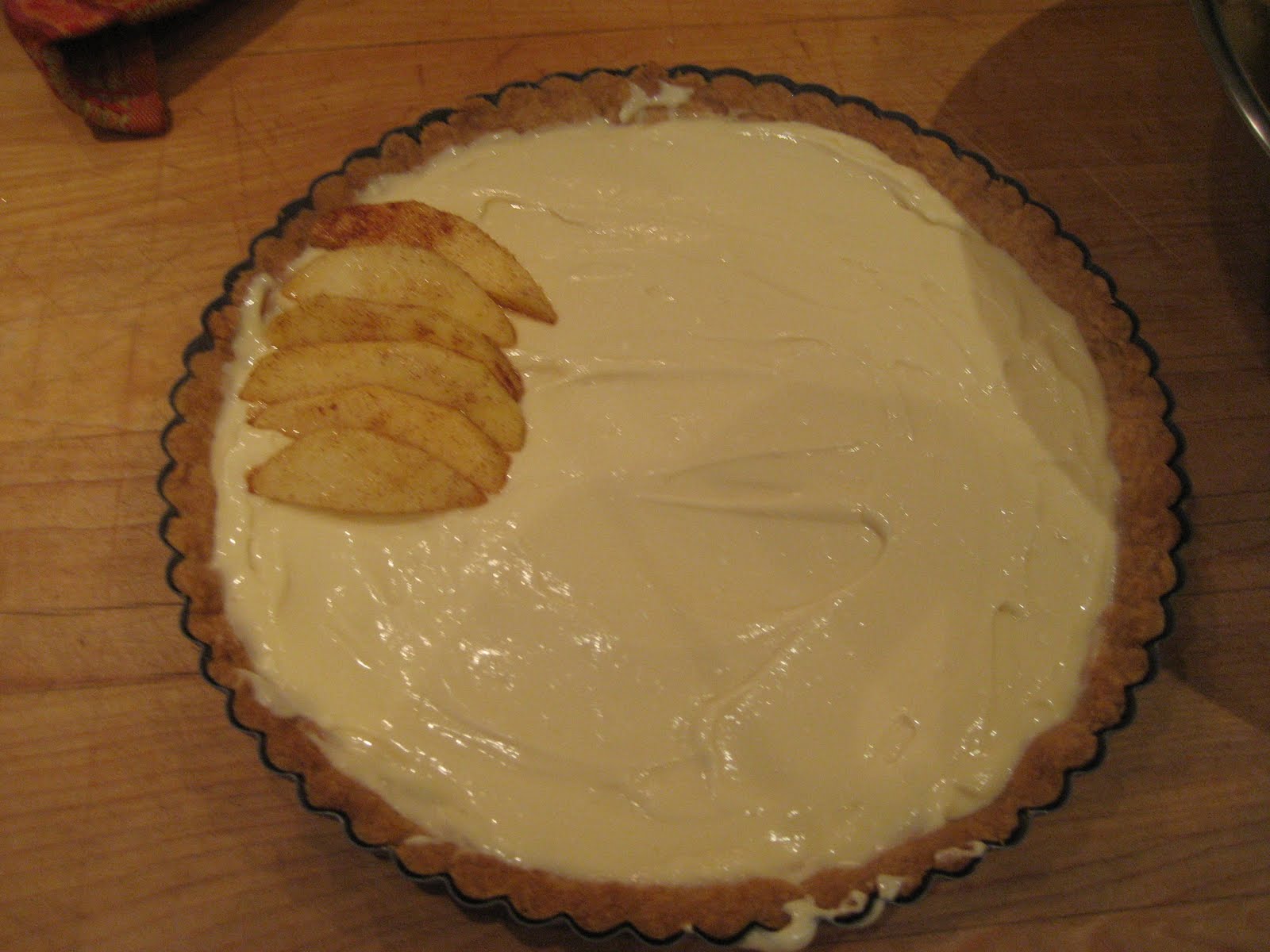 - Beat all the ingredients for the cream filling together until smooth. Make the topping by tossing the apple slices with the cinnamon, sugar, and nuts. Remove the tart shell from the oven. Spread over the cream mixture.
