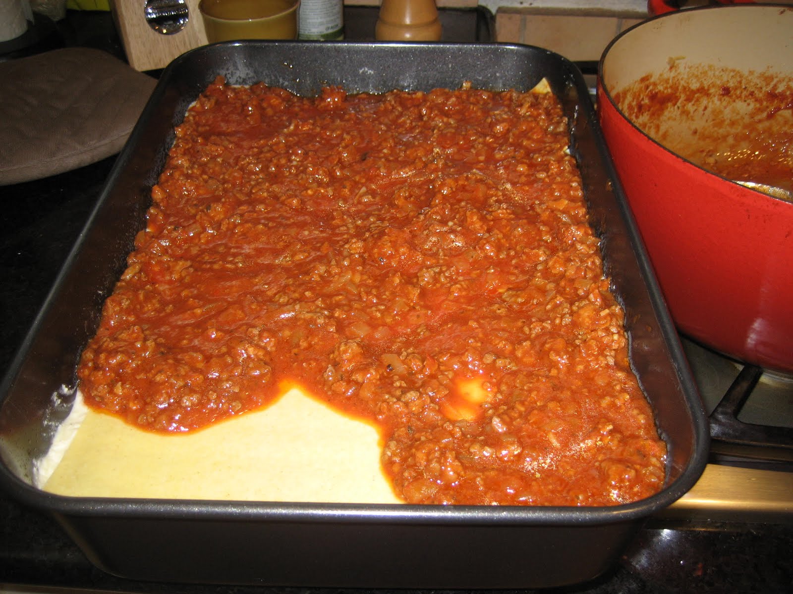 - Follow this sequence: a cup or so of sauce, a layer of noodles, half of the cheese sauce, one third of the grated Parmesan, noodle layer, meat sauce layer, noodle layer, remaining cheese sauce, one third of the grated Parmesan, noodle layer, remaining meat sauce, remaining Parmesan.